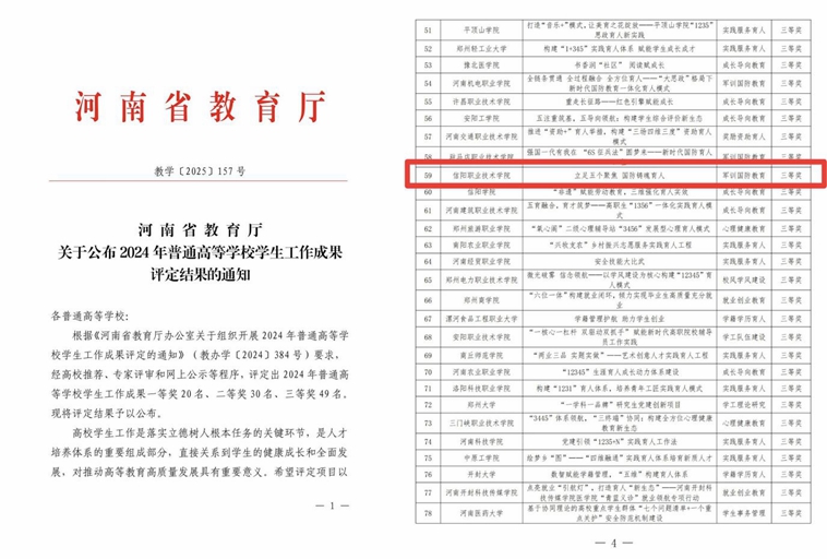 近日,河南省教育厅下发《乐动注册公布2024年普通高等学校学生工作成果评定结果的通知》(教学〔2025〕157号),经各高校推荐,省教育厅组织专家评审,通过网络评审、专家评议、现场答辩等多个环节,我校申报的《立足五个聚焦 国防铸魂育人》在400余个项目中脱颖而出,荣获河南省2024年普通高校学生工作成果奖。