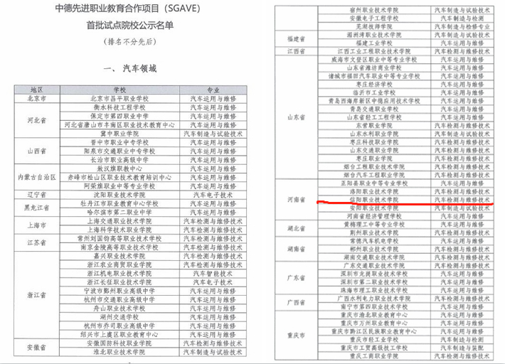 近日,教育部SGAVE中德先进职业教育对中德先进职业教育合作项目试点建设项目进行公示,我校汽车检测与维修技术专业成功获批首批中德先进职业教育合作项目试点单位与专业,全国试点院校仅289所,我校为河南省“汽车领域”获批的五所职业院校之一。