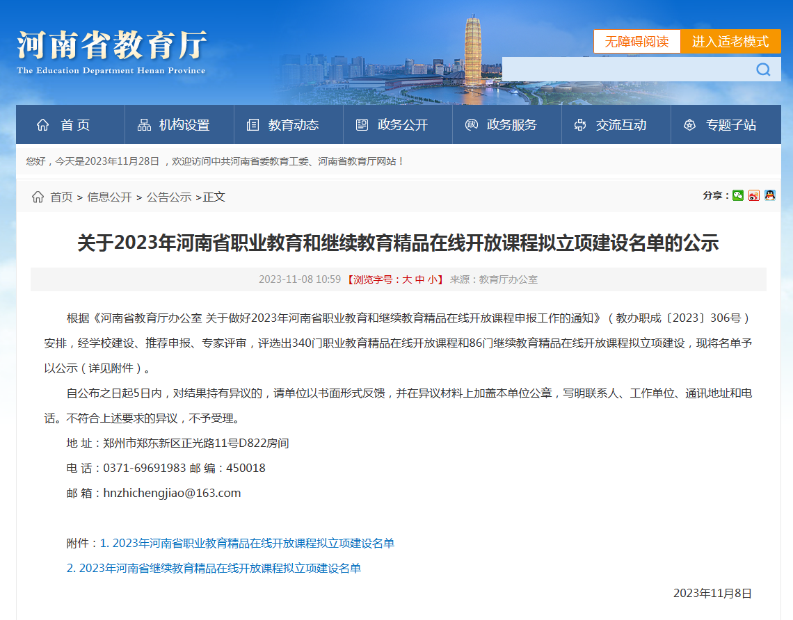 近日,河南省教育厅网站发布《乐动注册2023年河南省职业教育和继续教育精品在线开放课程拟立项建设名单的公示》,评选出340门职业教育精品在线开放课程和86门继续教育精品在线开放课程拟立项建设,我校《导游服务实训》等7门课程入选。
