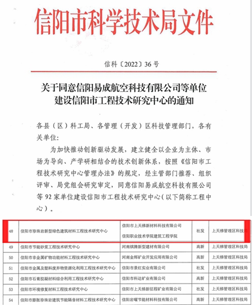为进一步深化产教融合,积极打造校企合作、高效联动、协同育人典范与样板,我校建筑工程学院与上天梯新材料科技有限公司联合建设“信阳市珍珠岩新型绿色建筑材料工程技术研究中心”。7月19日,获批建设信阳市工程技术研究中心。