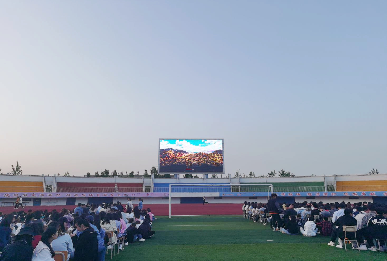 4月27日晚,应用外国语学院、药学院在学校体育场组织学生开展了“百部电影”进课堂活动,集体观看爱国影片《金刚川》。
